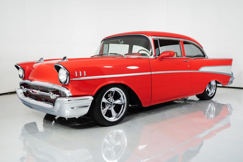 Classic Bel Air with modern performance upgrades, including an LS1 V8, automatic transmission, and independent rear suspension. Features a bright red exterior, tan bucket seat interior, power brakes and steering, and air conditioning. Built for comfort, style, and serious road time.